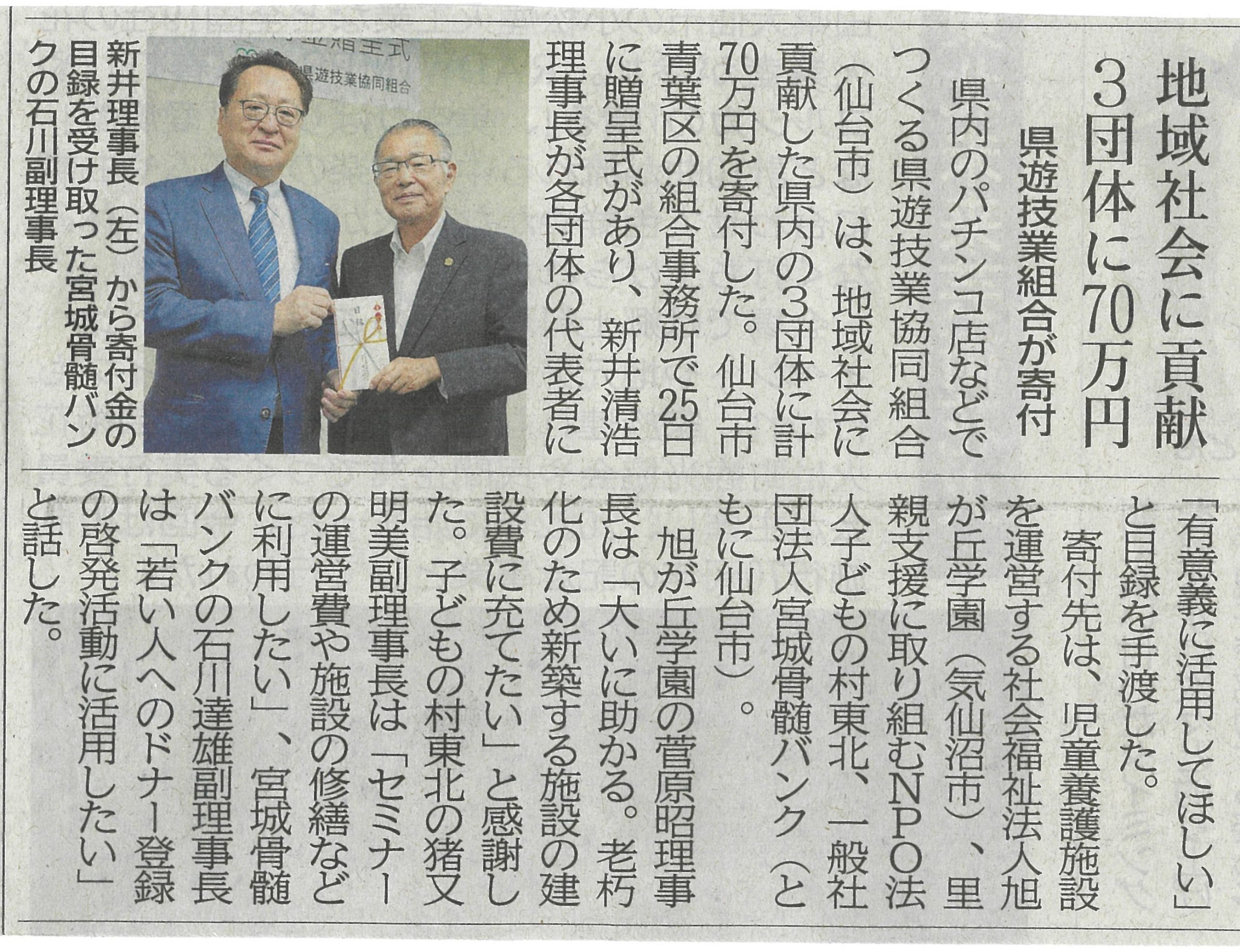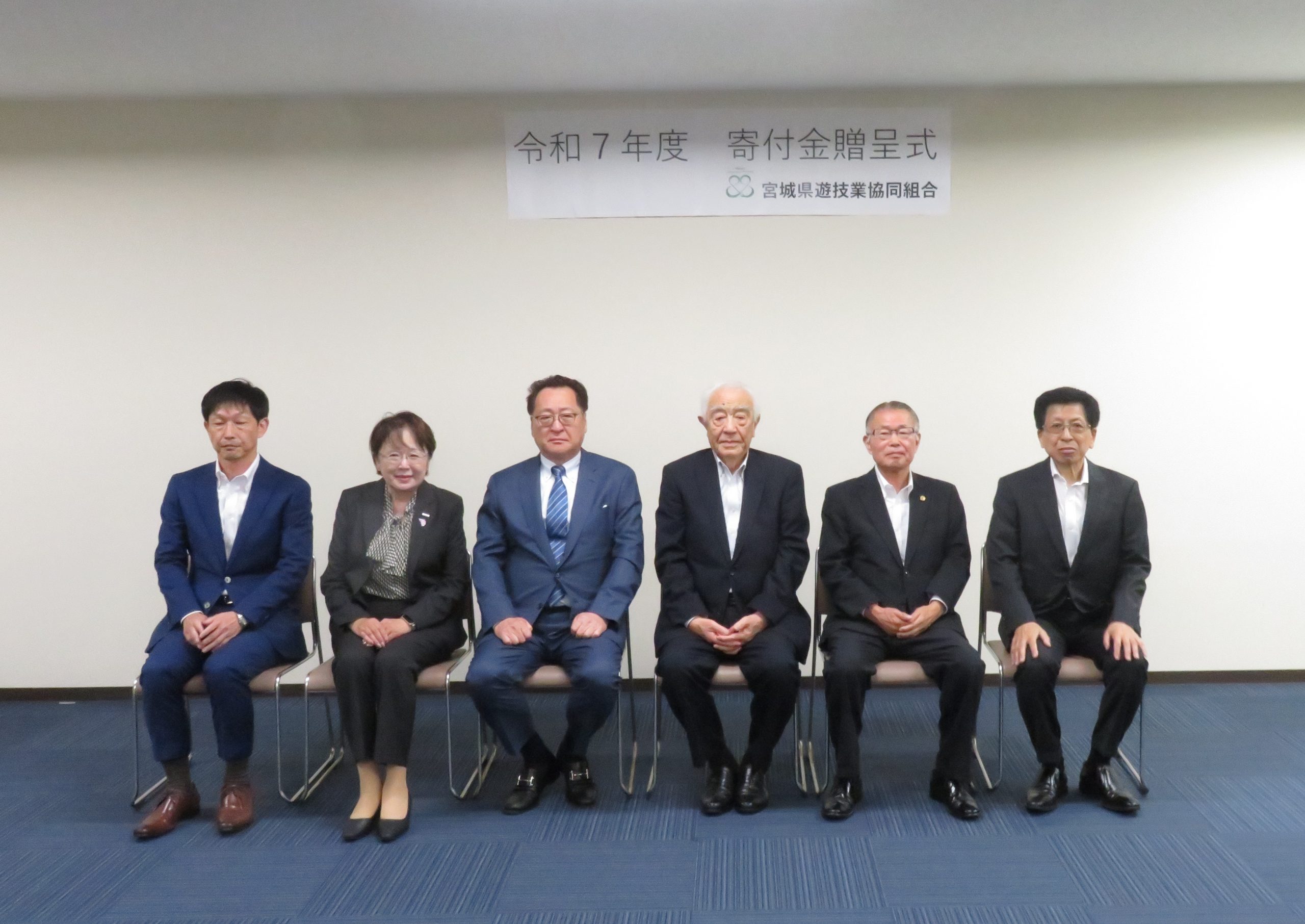 令和7年秋の寄付金贈呈式 令和7年9月25日(木)、社会貢献事業の一環として、①社会福祉法人旭が丘学園、②特定非営利活動法人子どもの村東北、③一般社団法人宮城骨髄バンクの3団体に対し、寄附金を贈呈しました。