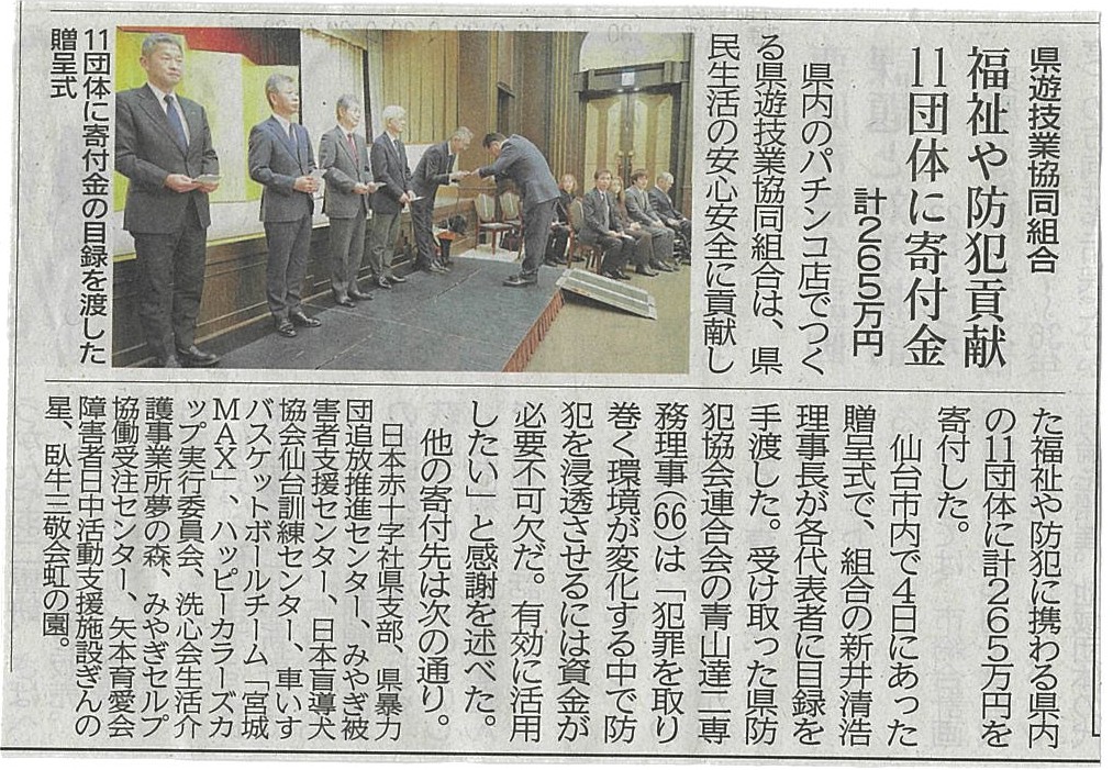 令和8年春の寄付金贈呈式の新聞記事 | 宮城県遊技業協同組合